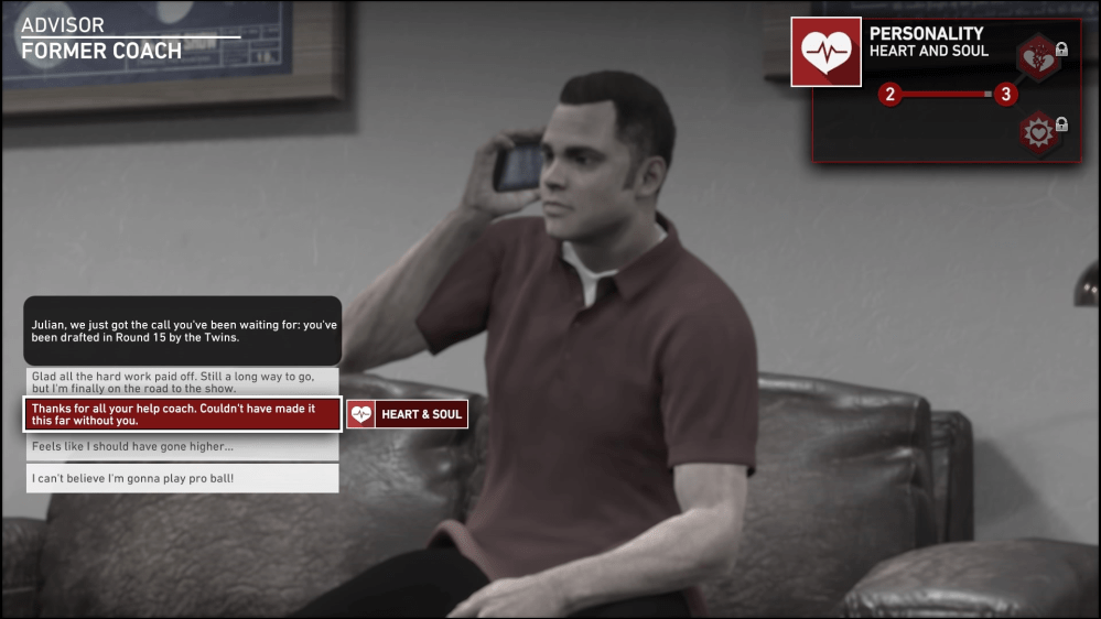 Doch leider können dies maximal Spieler erleben, die sich Hoffnungen ausmalen, bereits in der ersten Runde schon „vom Board“ zu sein. Nicht aber Spieler wie Julian Collins, die erst in der fünfzehnten Runde die Gunst eines Managers auf sich ziehen können. Erfahren hat mein Spieler sein Glück letztlich durch seinen früheren Coach, der im „Road to the Show“ Modus zu Beginn ebenfalls als Berater fungiert.