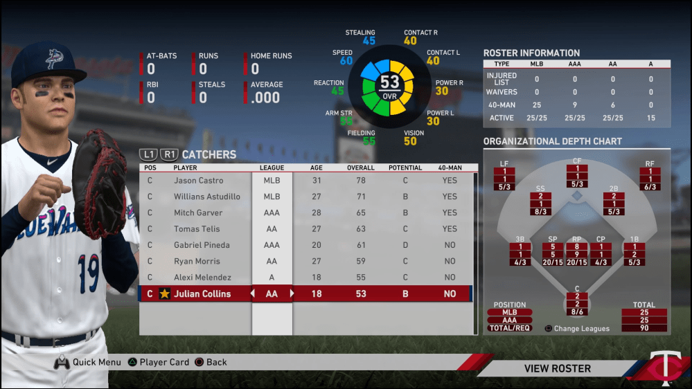 Wie auf dem oberen Bild zu erkennen, war ich noch ein ganzes Stück davon entfernt, in den MLB-Roster aufzusteigen, in dem sich Jason Castro und Willians Astudillo die Catcher-Position teilten. Und auch im Kader des höherklassigen AAA-Teams fanden sich mit Mitch Garver und Gabriel Peneda noch zwei Spieler mit beträchtlich höherer Gesamtstärke, an denen ich mich mit erstklassigen Leistungen erst noch vorbeispielen werden müsste.