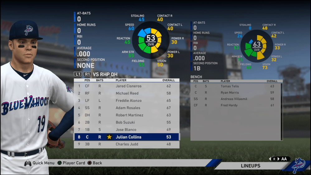 Im AA-Kader sortierte man mich zuerst einmal an achter Position der Batting Order ein (siehe unteres Bild), um wohl erst einmal zu schauen, wozu ich überhaupt fähig sein würde. Bei Teamkollegen mit Bewertungen von 48 bis 63 ordnete ich mich mit meinen 53 zuerst einmal im unteren Mittelfeld ein. Doch hatte ich absolut nicht vor, dort lang zu rangieren und mir hohe Ziele für meine erste Saison gesteckt: Noch vor Ablauf die Weiterfahrt nach Rochester antreten zu können!