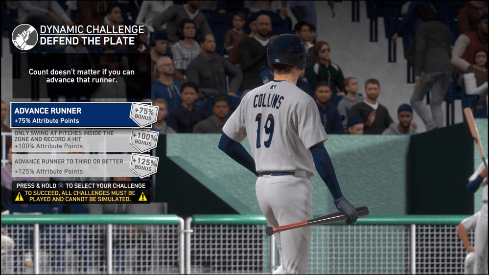In unregelmäßigen Abständen vor oder in einem Spiel bekommt man eine Herausforderung gestellt und muss sich dafür entscheiden, in welchem Maß man sich die Erfüllung derselben zutraut. Im obigen Beispiel geht es zum Beispiel darum, den auf der ersten Base stehenden Runner voran zu bringen, was mir 75% Bonus auf bestimmte Attributs-Verbesserungen geben würde. Wähle ich aber aus, dass ich ihn sogar auf die dritte Base bringen kann, könnte mir das einen Boost von 125% bringen. Bei Nicht-Erfüllung wird die Entwicklung betreffender Attribute hingegen entsprechend gebremst, weshalb man mit höheren Zielen auch ein höhere Risiko eingeht. Dies bringt in manche Spielsituationen noch mal eine besondere Relevanz.