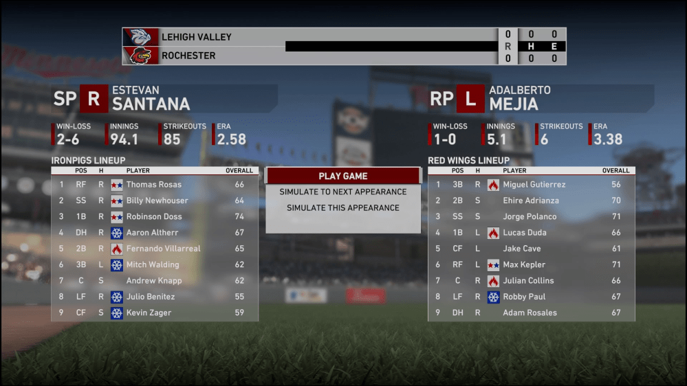 Die erste große Überraschung: Ein Teilziel – nämlich das, mit Mark Kepler zusammenzuspielen – konnte ich bereits bei meinem ersten Spiel für die Rochester Red Wings abhaken. Scheinbar war der Deutsche zum Farmteam nach New York degradiert worden. Das Lineup besagte: Max (Gesamtstärke: 71) schlug an sechster Position und ich (66) gleich danach an siebter.